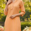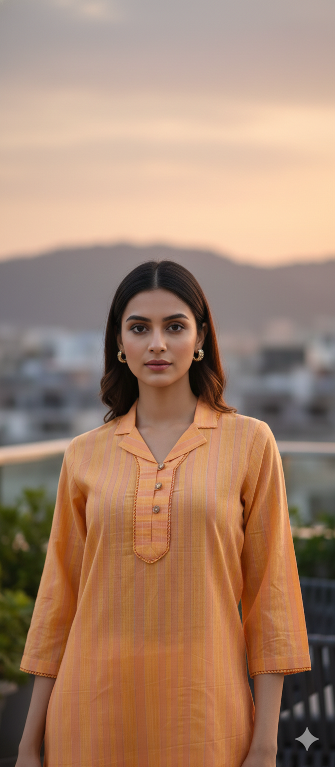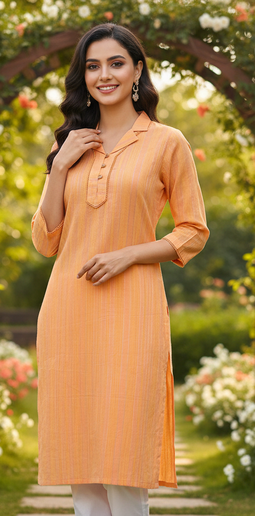 | Description | Bright and radiant, this striped orange straight-cut kurta adds a cheerful touch to your wardrobe. Featuring a structured collar and handcrafted details, it beautifully blends tradition with modern elegance. |
